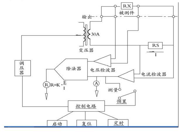 (3)接上負載,按一下“啟動”按鈕,調(diào)節(jié)“電流輸出”,來調(diào)節(jié)測試電流至規(guī)定值,即可進行測試,此時“mΩ”表將顯示被測件的電阻值。如果被測件電阻等于或大于電阻預置值,則儀器將超阻報警,蜂鳴器發(fā)出響聲,超限黃燈點亮,輸出電流被切斷,表示被測件不合格,按一下復位按鈕,解除報警,方可進行下次測試。如果測試電流超過30A,也會產(chǎn)生過流聲音警示現(xiàn)象。由于負載不完全一樣,測試時需調(diào)節(jié)“電流調(diào)節(jié)”至所需測試電流。