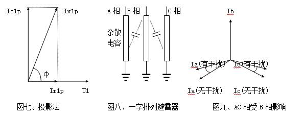 現(xiàn)場(chǎng)測(cè)量時(shí),一字排列的避雷器(圖八),中間B相通過(guò)雜散電容對(duì)A、C泄漏電流產(chǎn)生影響,使A相φ減小,阻性電流增大,C相φ增大,阻性電流減小甚至為負(fù),這種現(xiàn)象稱(chēng)相間干擾(圖九)。