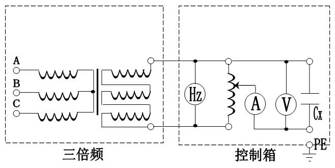 3.6此套試驗裝置帶有多抽頭的電抗器,當(dāng)三倍頻發(fā)生器帶上JCC1類型高壓串級式電壓互感器負載時,可在被試驗的高壓互感器某一繞組上接入可調(diào)的電抗器進行電流補償來提高整個試驗回路的功率因素.