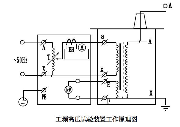 工頻高壓試驗裝置的工作原理圖見下圖。